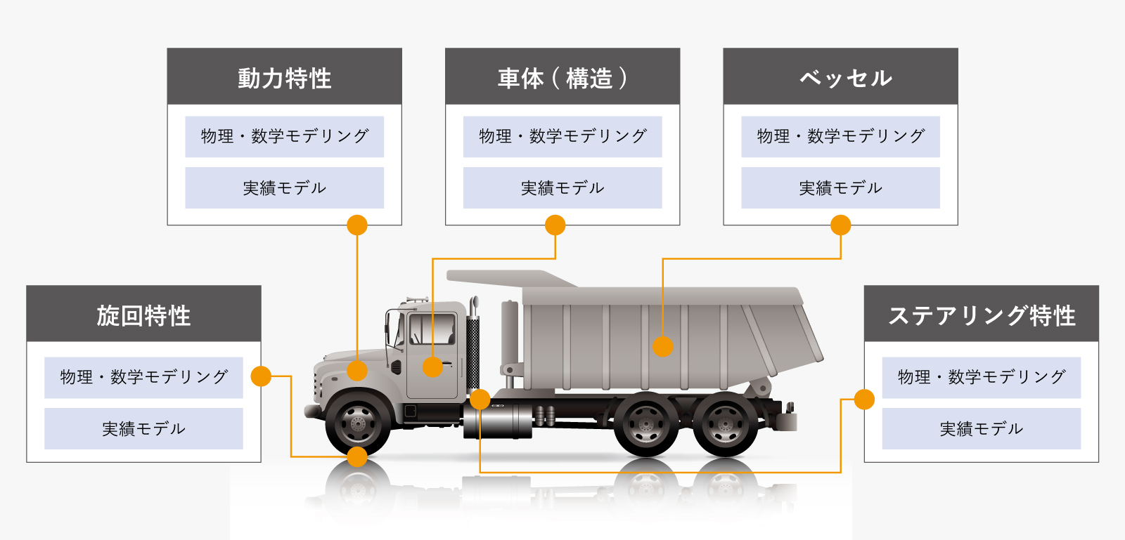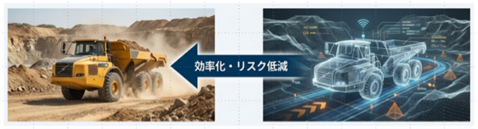アーティキュレートダンプの自動運転では、CIMや点群データから3D環境モデルを構築。車両の構造・運動特性を表す原理モデルと連携し、仮想空間上での連成シミュレーションを実現。これにより、安全かつ効率的な自動運転システムの開発が可能にしています。