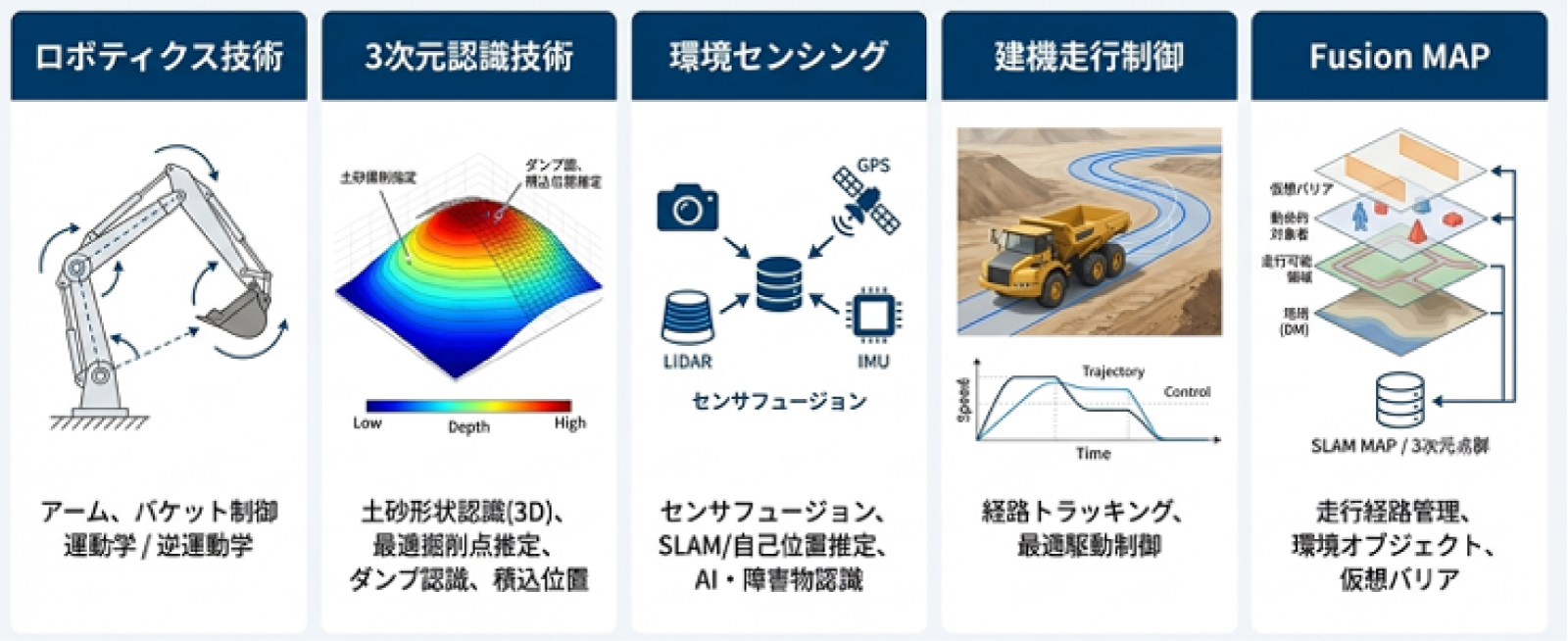 AZAPAは、建設現場における人手不足・安全性・効率性といった課題に対し、車両制御・ロボティクス・センシング・3Dシミュレーションといった多様な技術を統合し、安全かつスマートな建機自動運転の開発を実現しています。