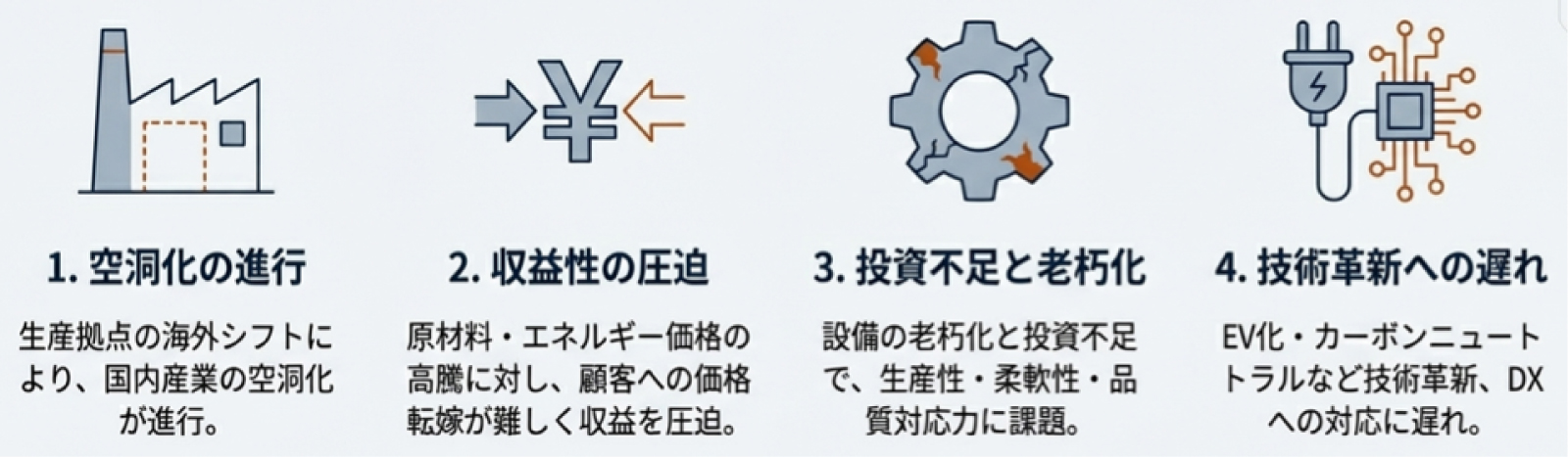これまで日本企業は、多品種少量生産と高度な品質管理によって世界のモノづくりをリードしてきました。しかし近年はコスト競争力の低下に直面し、国内工場の閉鎖や海外調達へのシフトが進んでいます。 加えて、長らく主要な製造委託先であった台湾メーカーでもコスト上昇が顕著となり、今や新たな製造パートナーの開拓が不可欠な時代を迎えました。 こうした中、急速に技術力と品質管理能力を高めているのが中国メーカーです。現在では、適切な管理体制を構築することで、日本企業の厳しい要求水準を十分に満たす製造が可能となっています。 このような背景から、日本企業が今後の競争力を維持・強化していくためには、日本の優れた設計思想と中国の製造力を融合させた「新たな製造戦略」が求められています。