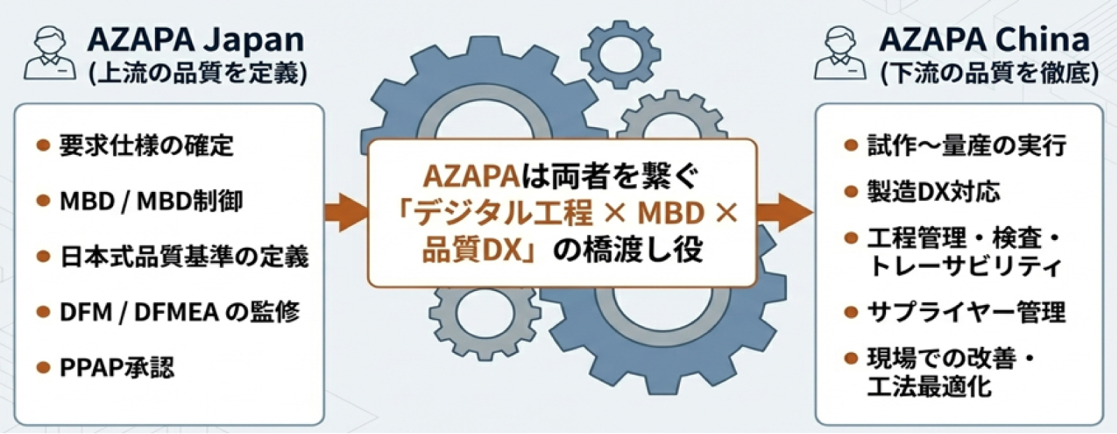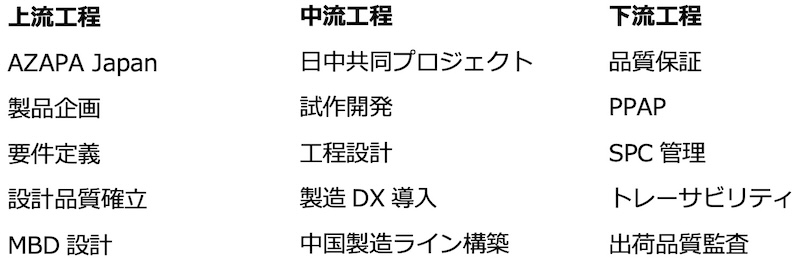 さらにAZAPAは、MBD(Model Based Development)や製造DX、品質工学といった手法を駆使し、「日本品質の設計」と「中国製造のスピード・コスト」を高次元で融合させ、量産まで確実に落とし込む体制をご提供します。