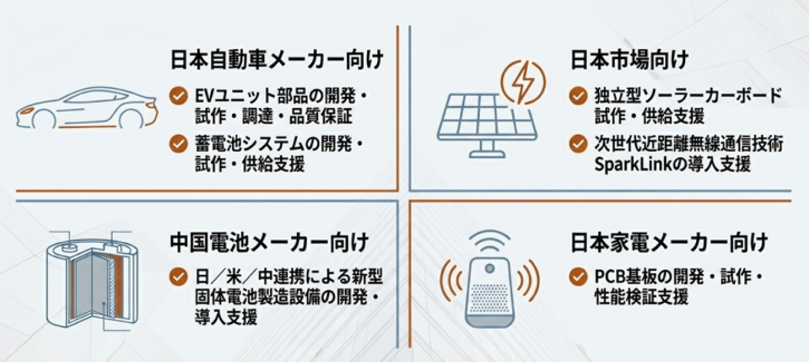 さらに、「日本人エンジニア」「バイリンガル技術者」が現地製造を監督し、「品質監査」「工程管理」「トレーサビリティ」を徹底することで、日本企業が求める品質レベルと中国製造のコスト優位性を両立します。