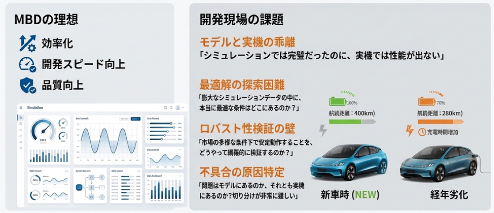 バーチャルとリアルの壁 シミュレーション(バーチャル)と実機データ(リアル)の間に存在する埋めがたい乖離です。モデルが理想状態に偏り、現実の複雑な挙動を反映しきれていないことで、開発の後工程での手戻りを引き起こします。