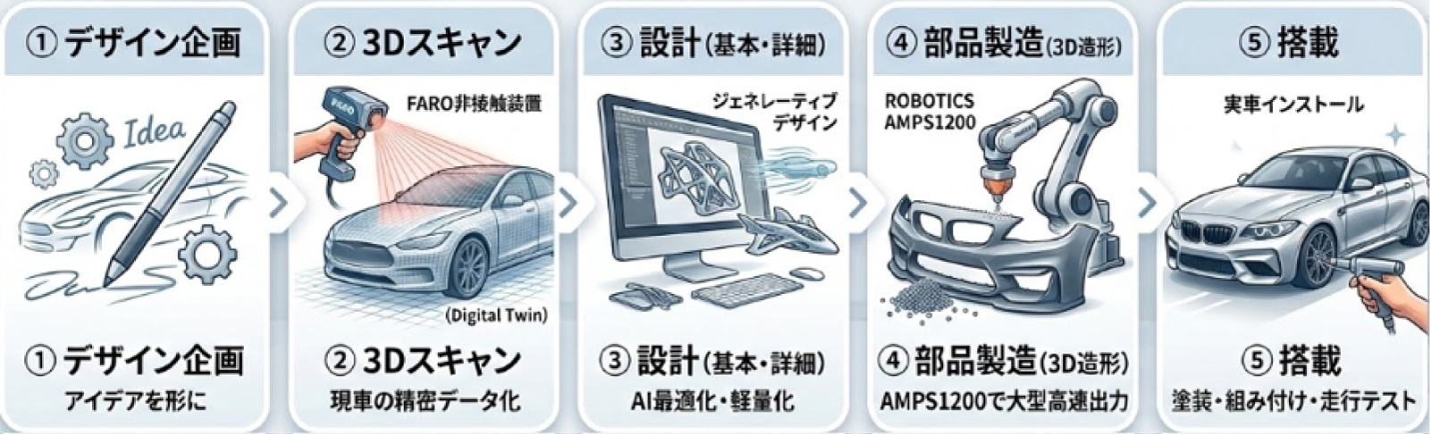 私たちは単なる「3Dプリント出力屋」ではありません。車両の構造を熟知したエンジニアが、以下のプロセスで貴方のプロジェクトを完遂させます。