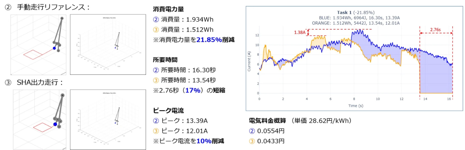 この 「作業最適検討アルゴリズム」 は 入力として 「最適」 を数式化の定義して、その数式による機械学習で最適解を探索する。現在、AZAPA では 6軸ロボットアームの「動作時間」と「使用エネルギー」を軸として、このアルゴリズムを検討しています。