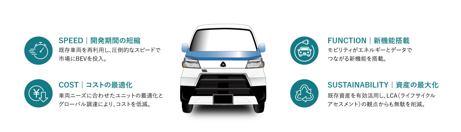 この『空白期間』を埋めるため、AZAPAが提示するソリューションが「EVコンバージョン(EVC)」という戦略的選択です。これは単なる「古い車の電動化」ではありません。軽商用BEVを地域の「動く蓄電池」としていち早く市場へ投入し、新たな価値を提供するための最速のアプローチであると考えています。