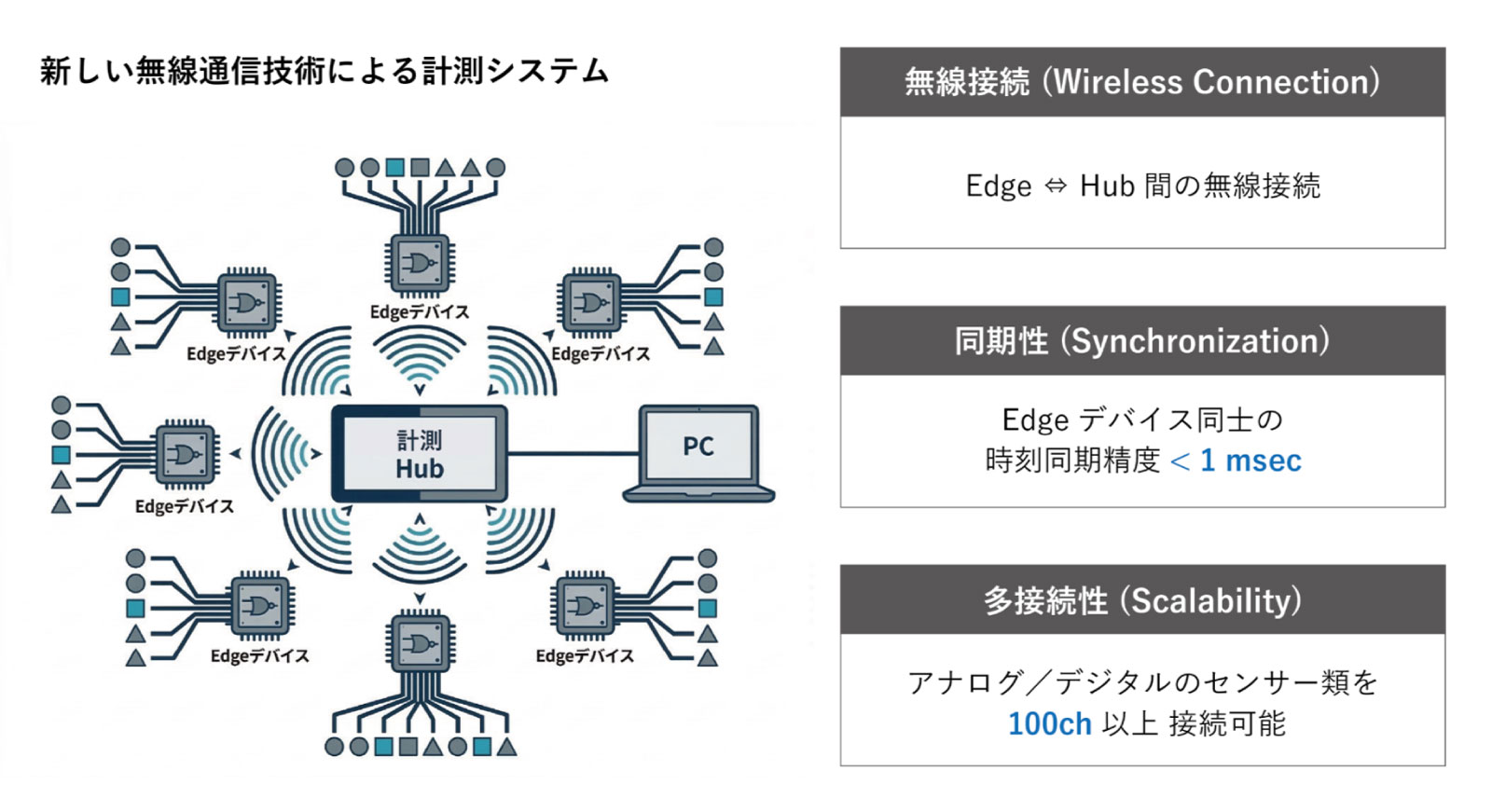 我々はまずその解決から取組んでおり、100chは超えるであろう膨大なセンサー群を可能な限りワイヤレスでロギングできる計測システムの開発を進めています。全てのデータが1ms以下の精度で同期して計測できる必要があり、従来ワイヤレスセンサの主流であるWiFiやBluetoothでは困難なため、新たにSparklink方式を核とした計測HUBを開発し実証実験を開始しています。